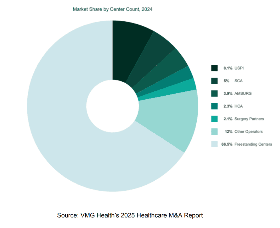 Despite this growth, the market remains highly fragmented, with approximately 67% of freestanding ASCs still independently owned and operated, as evidenced by VMG Health’s 2025 Healthcare M&A Report (pie chart below). The remaining facilities are concentrated among national operators such as USPI (owned by Tenet Healthcare), SCA Health (owned by Optum/UnitedHealth), AMSURG, HCA, Surgery Partners, and other operators. This fragmentation, coupled with steady case migration from hospitals to outpatient centers, makes ASCs a focal point for investment.