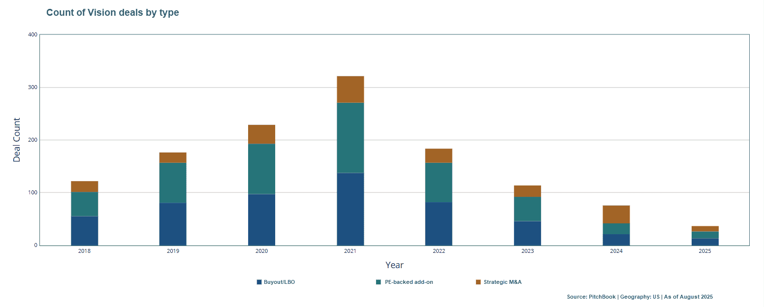The chart below, sourced from PitchBook, illustrates this transition: from the 2022 peak to a slowdown in 2023. While the pace of deals has started to shift, eye care has remained one of the most resilient and competitive specialties, drawing strong interest from both traditional private equity platforms and corporate conglomerates alike.